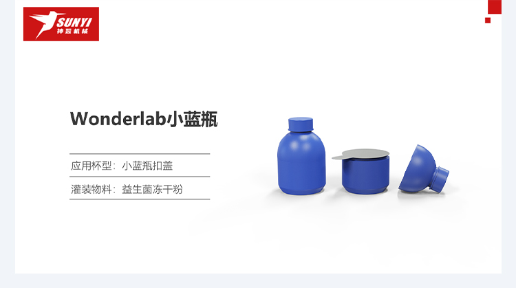 为了进一步扩大产品产量,提高生产效率,神翌机械依靠在小杯灌装领域丰富的技术经验,并充分考虑市场与客户需求进行定制化设计,为WonderLab提供了适配小蓝瓶的「SC-6高效益生菌灌装封口扣盖机」。